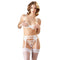 Pale and Pure. A delicate bra, thong and suspender belt ensemble of white net fabric combined with stretch satin and petite bows. Underwired bra with slitted cups and adjustable shoulder and suspender straps. Bra and suspender belt fabric. Stockings not included.