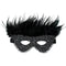 Black satin look mask with lace overlay. Black feathers adorn the crown. Elastic strap back for comfort.