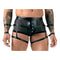 Black pants made out of matte look with Powernet, with 2 restraints per side, stretchy for a comfortable fit An exclusive, captivating design! Black pants from Svenjoyment Bondage are made out of transparent powernet combined with beautiful matte look material. Tight-fitting but stretchy for a comfortable fit. The pouch has press studs which mean that it can be opened erotically. There are two rings at either side with handcuffs and arm loops attached to them, the arm loops are attached to the pants and the handcuffs are attached to the thigh straps. The restraints are removable and have hook and loop fasteners.