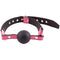 Leather, adjustable buckle strap with a red or black rubber ball gag. Gag 5.5 Inch Circumference